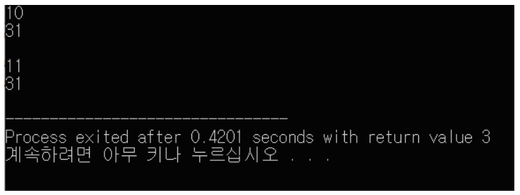 그런데 결과를 보면 10, 31로 출력이 됐습니다.