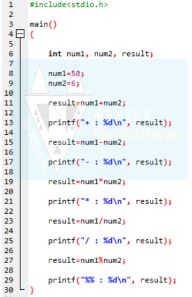 C언어에서 곱하기는 X 대신 *을 사용하고, 나누기는 ÷ 대신 /를 사용합니다.