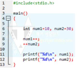 8행에서의 후위 방식은 우선 printf 함수로 출력을 하고(10 출력) num1의 값을 하나 증가시키고, 9행에서의 전위 방식은 num2의 값을 하나 증가시키고 printf 함수로 출력(31 출력)을 한 것입니다.