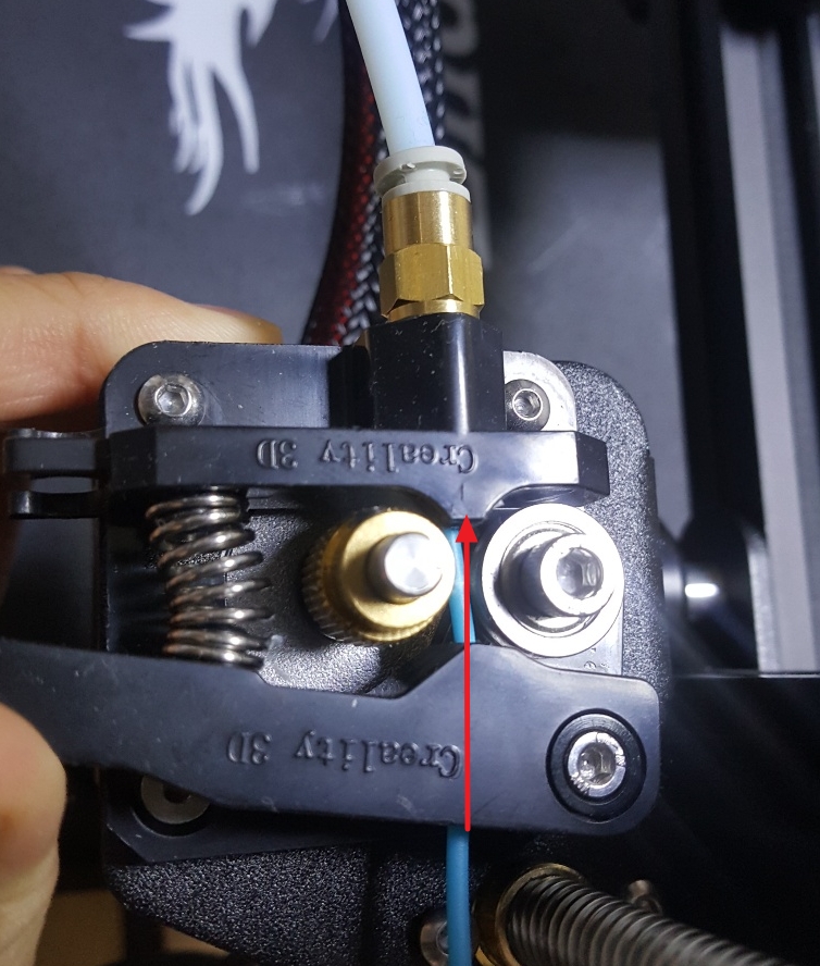 노즐이 185도가 되었으면 필라멘트를 넣는 부품의 집게 부분을 손으로 잡아 벌리고 필라멘트를 화살표 방향으로 밀어 넣습니다.