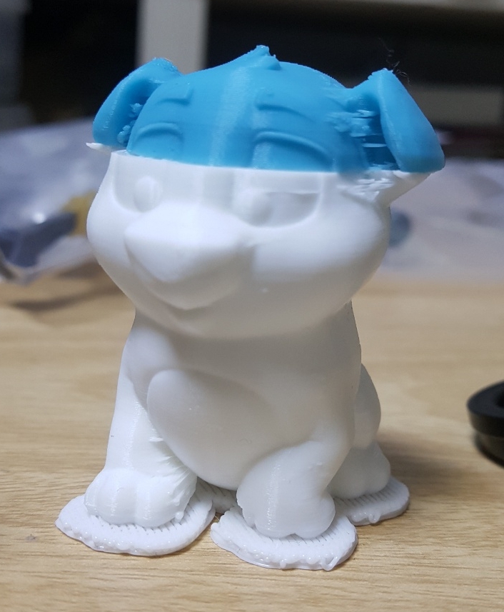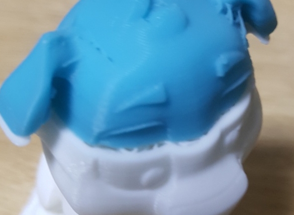 머리 부분의 색이 다른 이유는 테스트용 필라멘트로 출력하는 도중 출력을 멈추고 필라멘트를 교체했기 때문입니다.