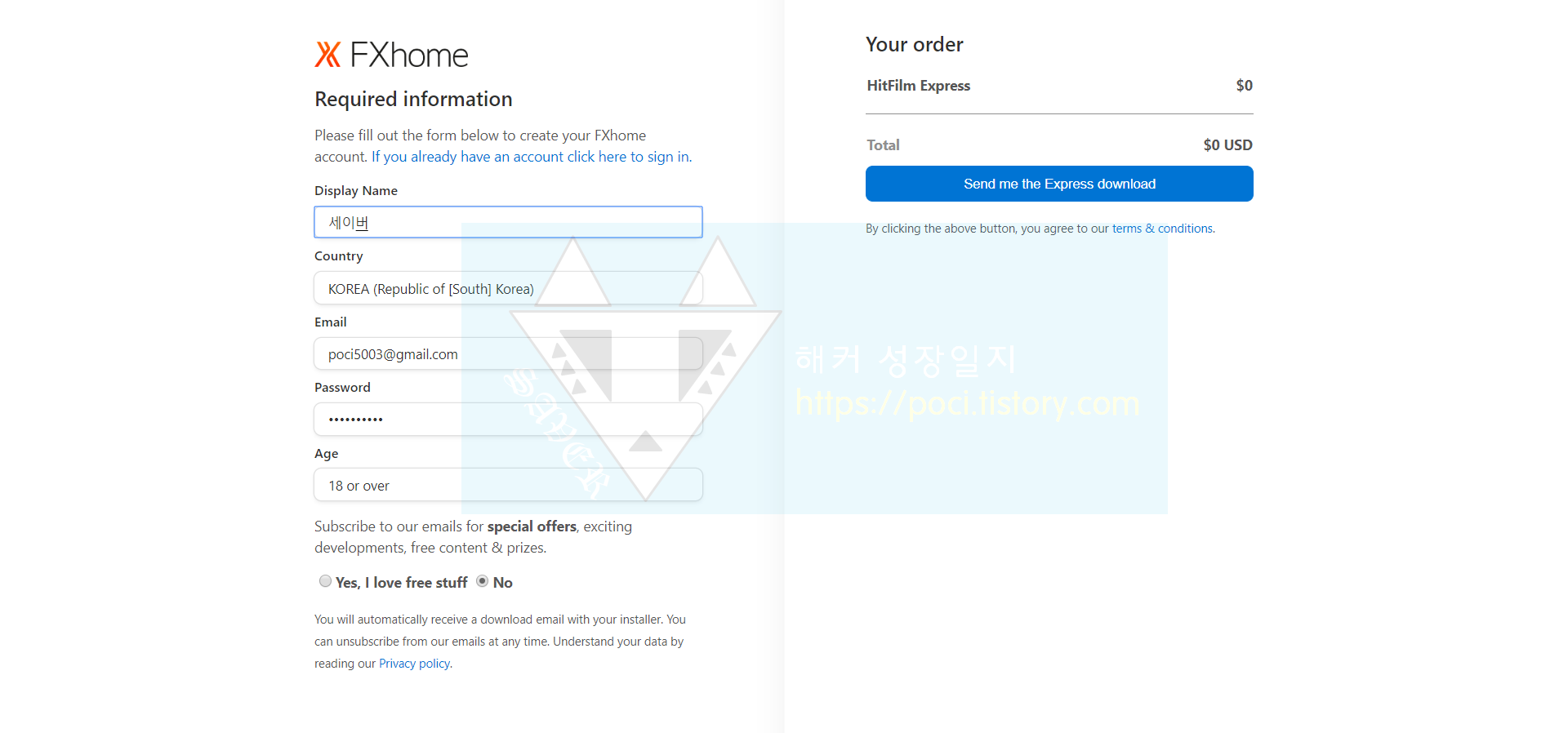 이메일, 국가 등 인적사항을 적고 Send me Express download를 클릭합니다.