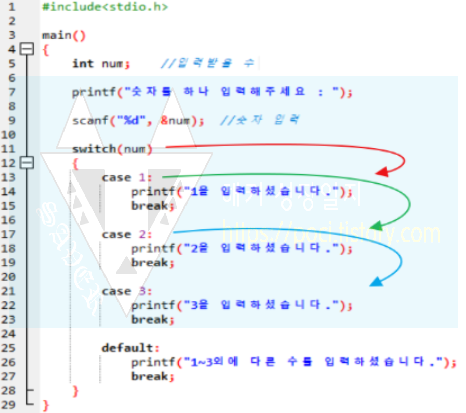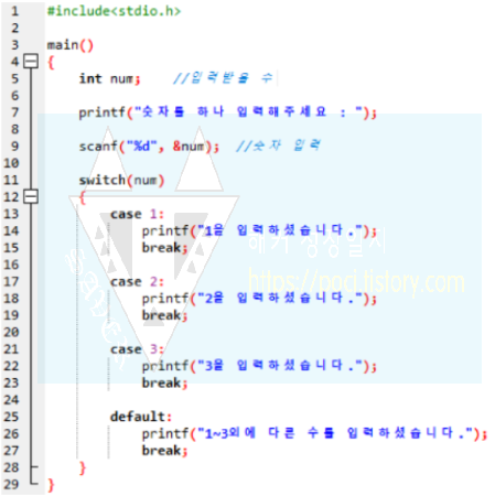 num에 1~3이 아닌 다른 수가 들어가면 default 부분의 26줄 printf 함수가 동작하게 됩니다.