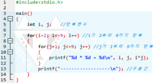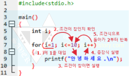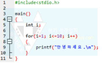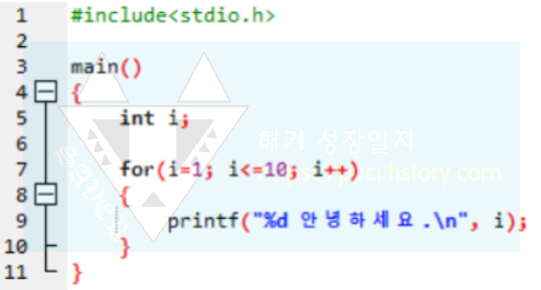 7줄의 for 함수를 보시면 i=1; i<=10; i++가 보이실 겁니다.