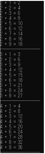 이렇게 for 함수 안에 for 함수를 넣음으로써 위와 같은 구구단을 구현할 수 있습니다.