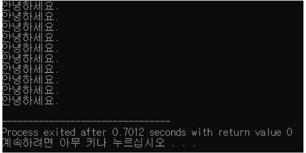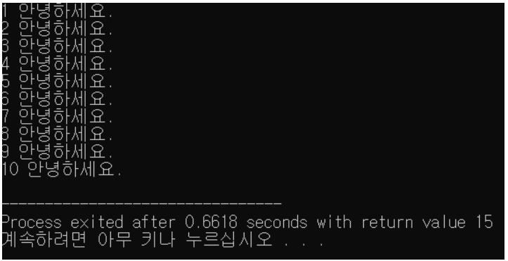 위 코드는 "안녕하세요."를 10번 반복해서 출력하는 코드로 for 함수를 이용하였습니다.