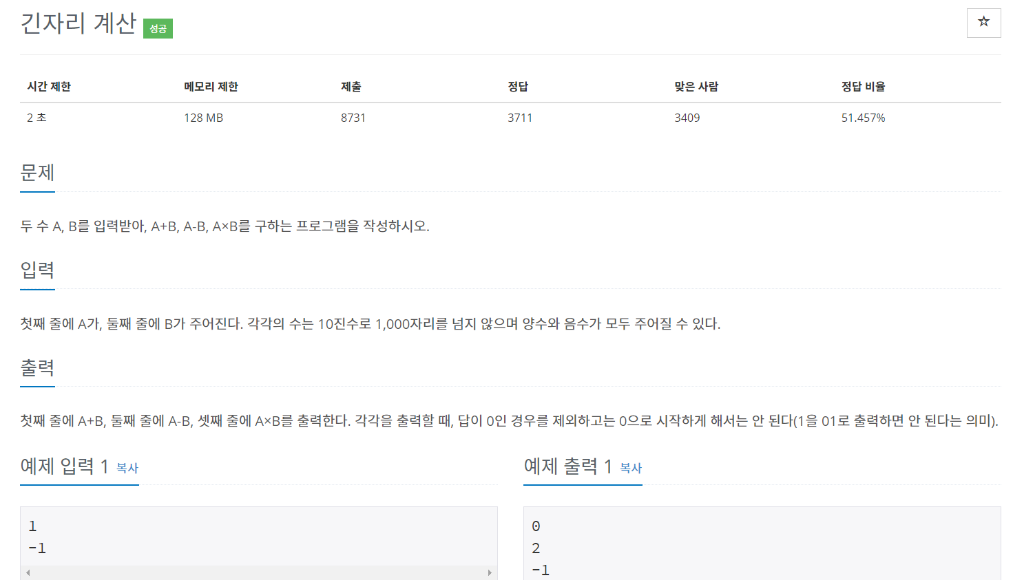 두 수를 입력받으면 두 수의 더한값, 뺀값, 곱한 값을 출력하는 문제입니다.