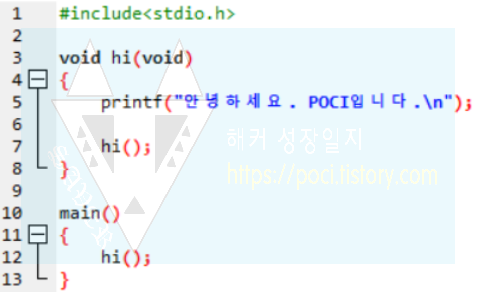main 함수는 hi 함수를 한번 호출했지만, hi 함수가 계속 본인을 호출하므로 [안녕하세요. POCI입니다.]가 계속해서 출력됩니다.