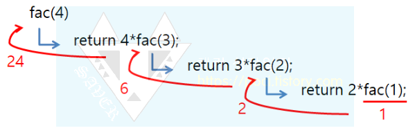 fac(4)의 return 값이 4*fac(3)이므로 24(4*6)가 됩니다.
