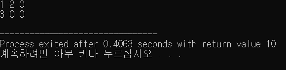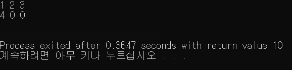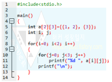또한, 초기화 값이 설정되지 않은 공간은 0이 대입됩니다. 그래서 a[1][1], a[1][2] 부분의 값이 0으로 출력되는 것입니다.