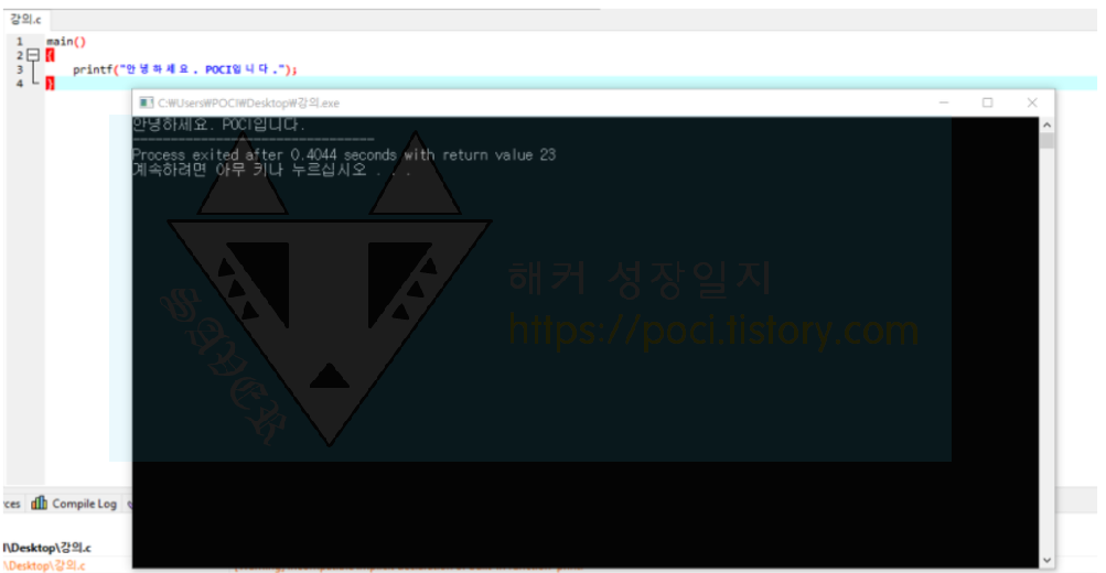 위와 같이 printf() 함수를 쓰신 다음 [Exrcute]-[Compile & Run]을 클릭하면 컴파일을 하고, 컴파일이 완료되면 실행이 됩니다.