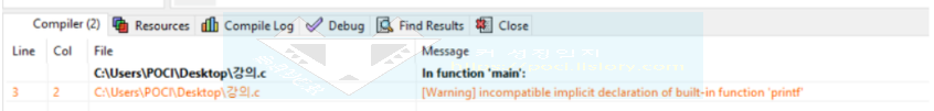 Warning이라고 뜬 부분을 해석하면 '호환되지 않는 내장 함수 'printf'의 암시적 선언'이라고 합니다.