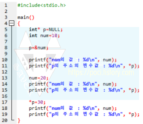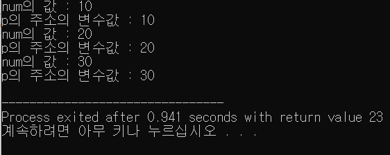 17행에서는 p를 이용해 num의 값을 간접적으로 30으로 바꿨습니다.