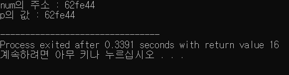 num의 주소와 p에 대입된 값이 일치한 것을 확인할 수 있습니다.