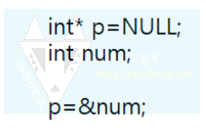 - 포인터 선언법 : int* p=NULL;와 같이, *와 NULL를 써준다.
