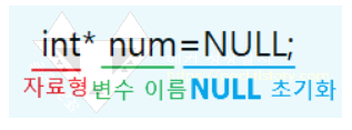 단, 포인터는 *를 붙여서 포인터임을 강조하고, NULL로 초기화를 해야 하는 것이 특징입니다.