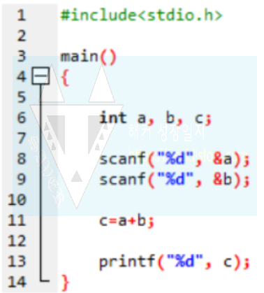그럼 정수형 변수 세 개를 선언하고 두 개의 변수에다가 값을 입력하도록 해줍시다.