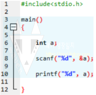 이렇게 하시면 8행에서 scanf 함수로 a에 값을 넣고, 10행에서 printf 함수로 a의 값을 출력합니다.